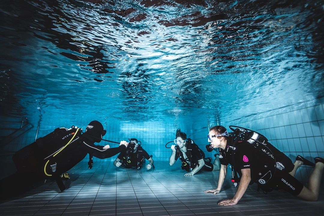 Den praktiska delen av Open Water dykkursen inleds först i poolmiljö, då man som dykare lär sig grunderna just i poolen. Vi tränar på grundövningar i bassäng – tryggt, lugnt och steg för steg. Du får känna på hur det är att andas under vatten, lära dig hantera din utrustning och träna viktiga moment som avvägning och nödsituationer. Pooldelen är upp till 6 timmar lång – mer än branschstandard!