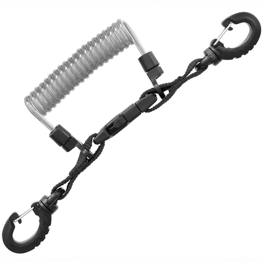 Mares Lanyard Inox Spiral är ett kompakt och säkert sätt att fästa utrustning som ficklampa, kamera eller SMB under dyk. Den spiralformade vajern i rostfritt stål med fästögla förhindrar att du tappar viktiga tillbehör i vattnet, samtidigt som den flexibla designen ger dig frihet att använda utrustningen utan att koppla loss den.