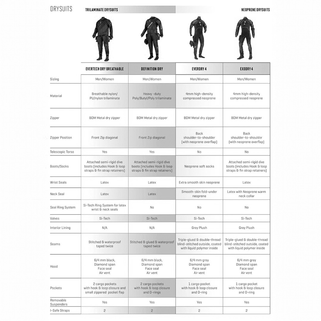 Dräkten har dubbeltejpade vattentäta sömmar, en BDM metallisk diagonal dragkedja framtill för enkel på- och avtagning, samt latexmanschetter vid handleder och hals för effektiv tätning mot vatteninträngning.